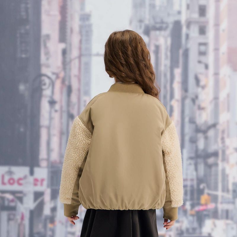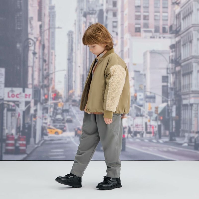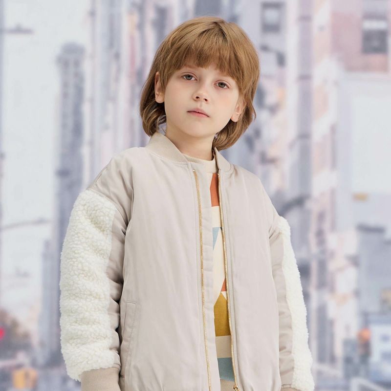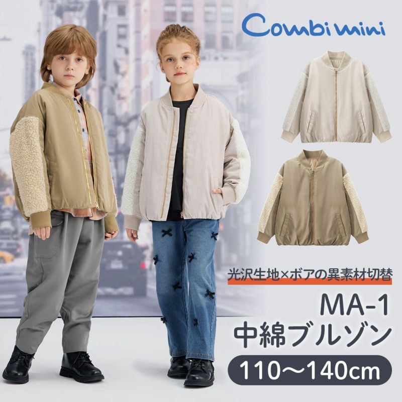 【仕様】袖の切り替えにボアを使ったデザインで袖口は編立リブで寒い日の風をシャットアウト。ディティール、トレンド感にこだわったMA-1は110~140サイズ展開の重宝する一着です。
