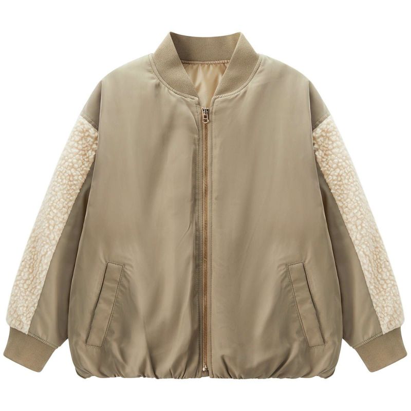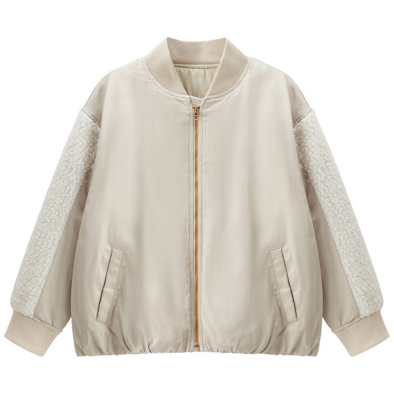 【素材】光沢感のあるツイル目のポリエステル100%の生地にボアを組み合わせた異素材切替のMA-1タイプの中綿ブルゾン。