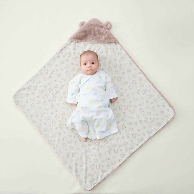 【仕様】クマ耳フードがキュートな定番ボアのふわふわおくるみ。寒い日のお出かけやお昼寝時のブランケットとしても役立つアイテムです。