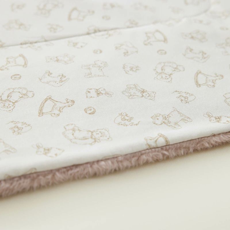 【素材】外側はボリュームたっぷりで、毛足の長いポリエステル100%のボアフリース。赤ちゃんに触れる内側にはなめらかな肌ざわりの綿100%天竺素材を採用。寒い季節にも重宝する軽くて温かい素材です。