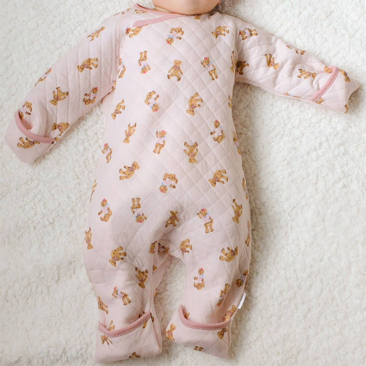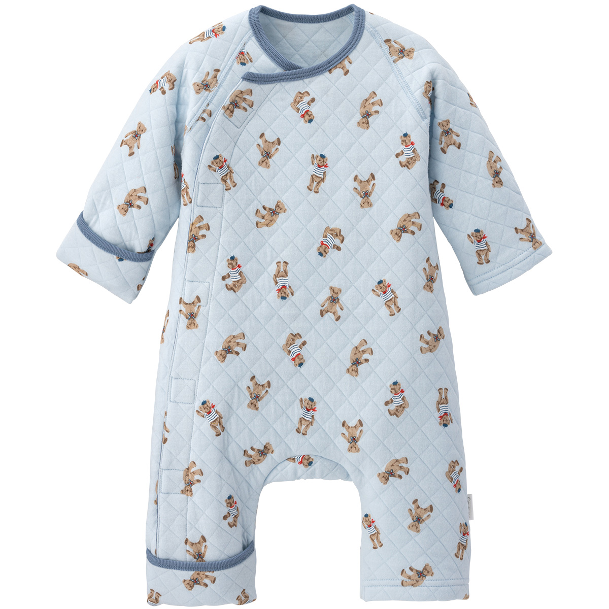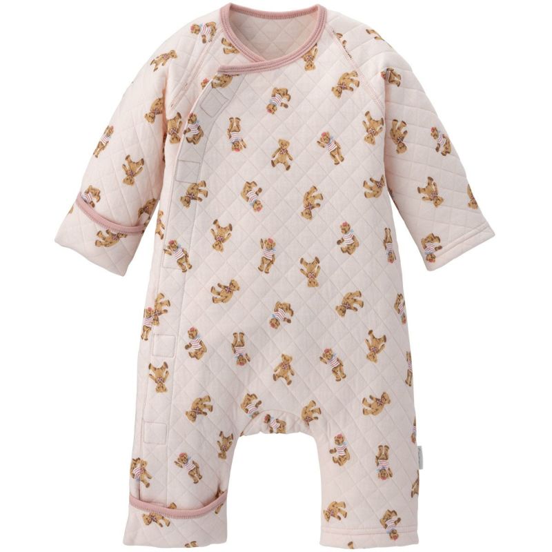 肌に触れるキルトの両面は綿100%の、あたたかなニットキルトを使ったラップクラッチ。袖口と足口部分はくるんと返すと手足を包むカバーになります。ワンタッチテープでサッとお着替え出来るので、おむつ替えもラクチン。ティディベアの総柄が可愛らしく、男女問わずおすすめです。同柄でキッズパジャマ、スリーパー、ママサイズパジャマも展開しているので、色違いやおそろいも楽しめます。