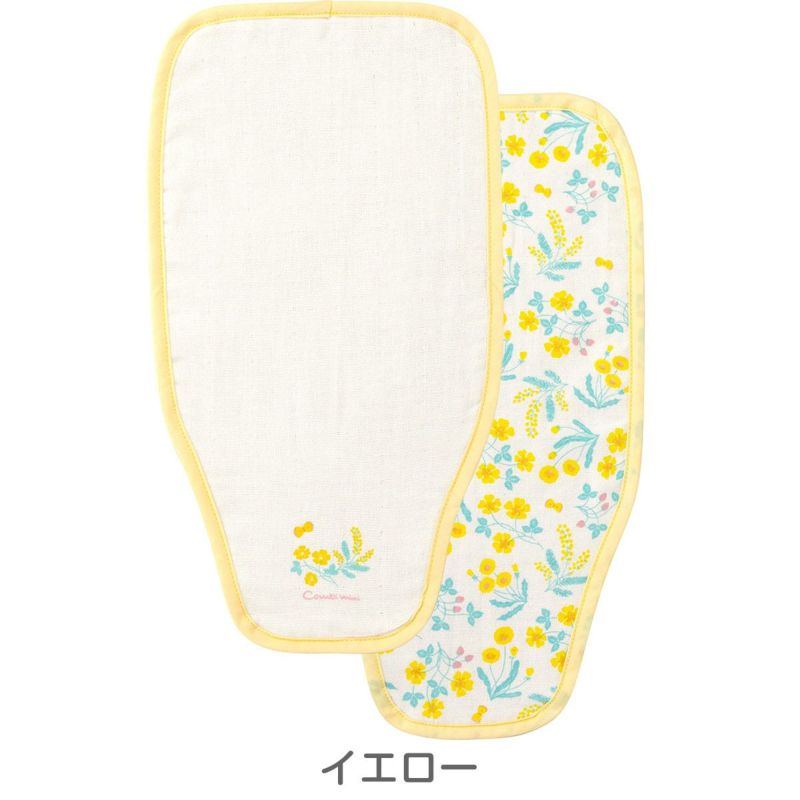 洗い替えに便利な2枚組の汗取りガーゼです。表はガーゼ、裏はタオルの綿100%素材で、しっかりと汗を吸収。就寝時の寝汗での冷え防止にも役立ちます。黄色を基調にタンポポやミモザ、いちごなど野の花々にチョウチョをプリント。女の子向けのやさしい絵柄です。