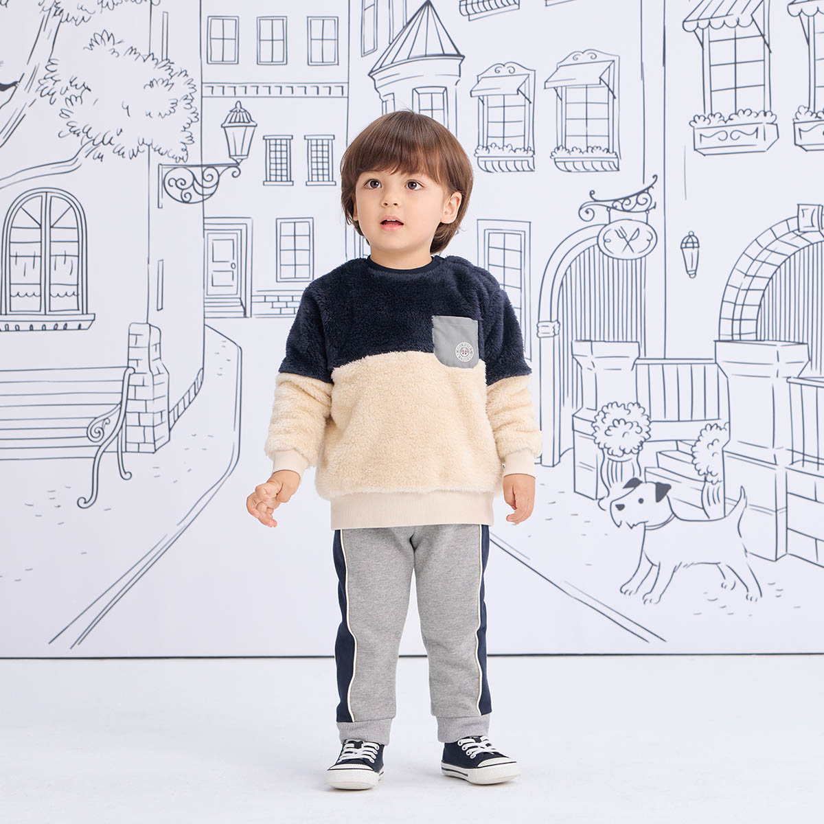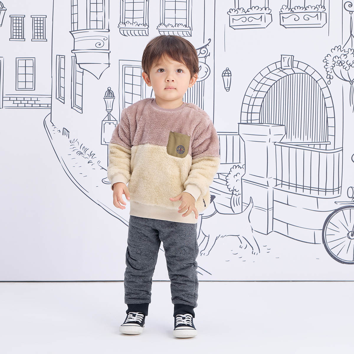 【カラー】ネイビー、グレーピンクの合わせやすく、使いやすい2色展開です。配色ポケットはポリエステルツイルの異素材使いで、アンカーの刺繍をワンポイントで取り入れました。ボアフリースのシリーズでベビーからキッズまで幅広く展開しているので、リンクコーデを楽しむのもおすすめ。