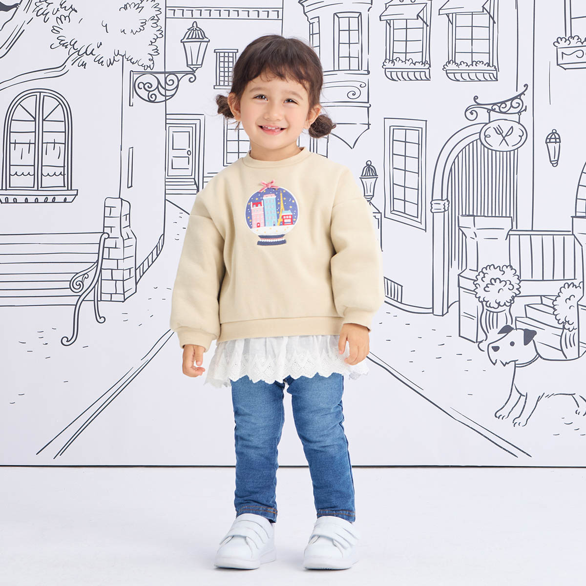 【カラー】合わせやすく着回しがしやすいライトベージュと杢グレーの2色展開。前身頃にはキュートなスノードームを模したアップリケを大きく取り入れました。ゴールドラメプリントのエッフェル塔や頂点のベルベットリボンの飾りがオシャレ感を演出します。