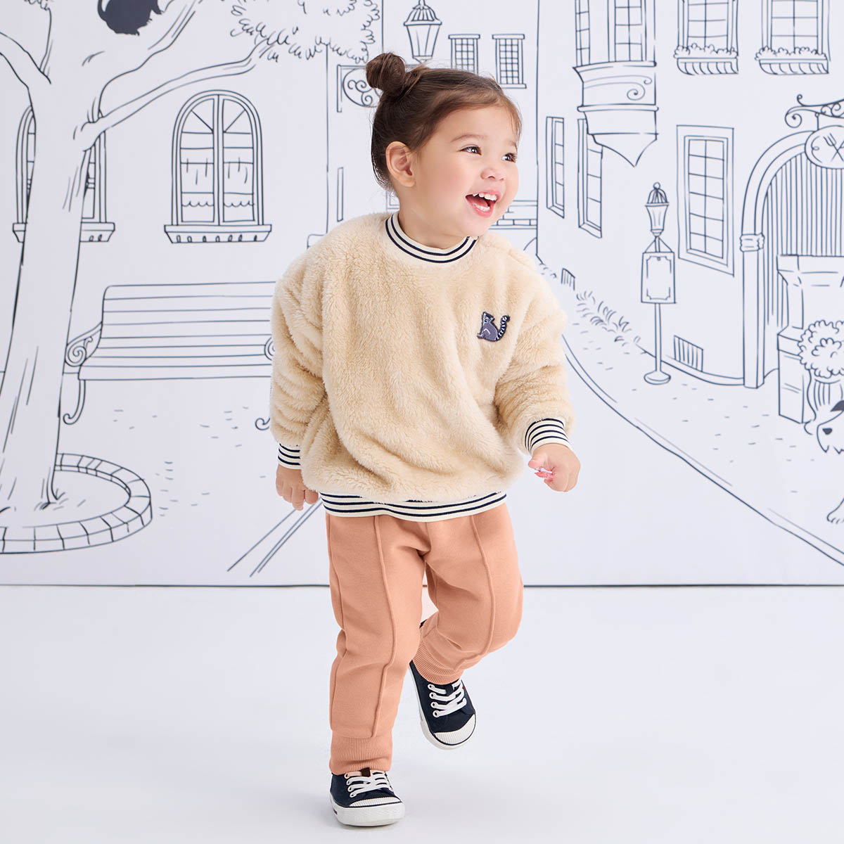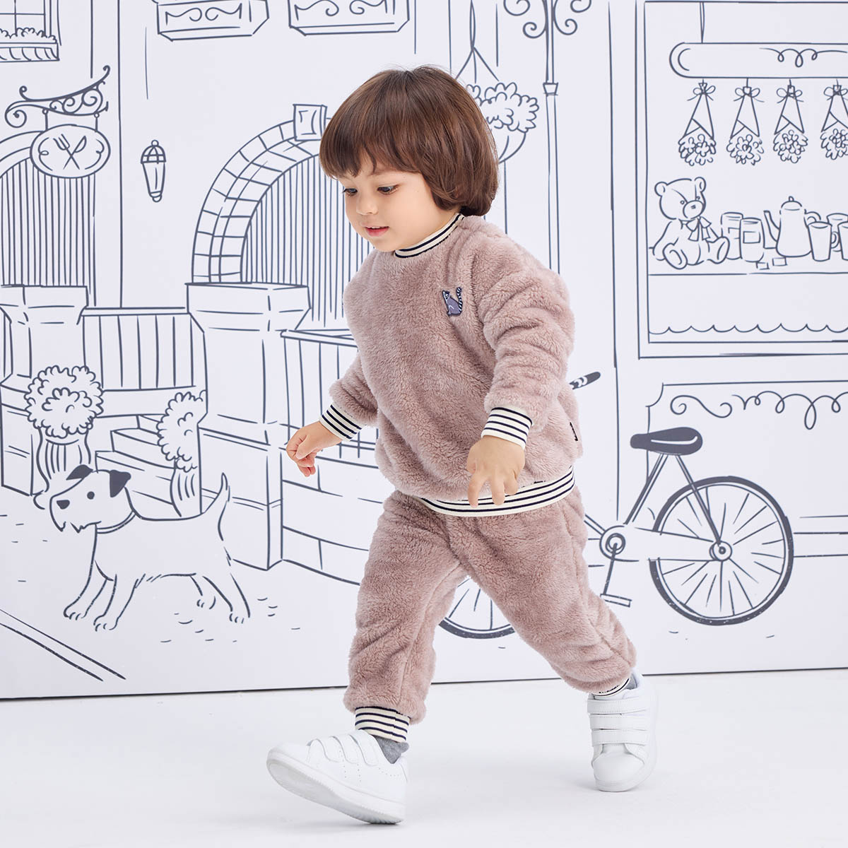 【素材】ボリュームたっぷりで、表面、裏面とも毛足の長いポリエステル100%のボアフリース。寒い季節にも重宝する軽くて温かい素材です。ボアフリースのシリーズでベビーからキッズまで幅広く展開しているので、リンクコーデを楽しむのもおすすめ。