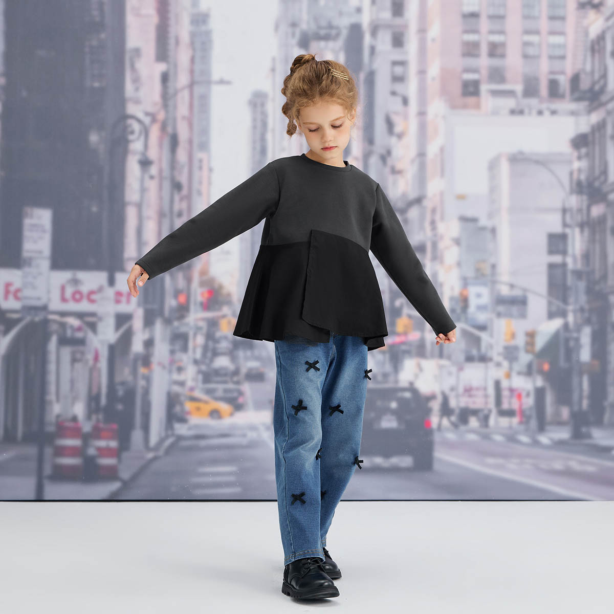 【仕様】アシンメトリーな切り替えが目を引くペプラムデザインのフレア部分にはブロード生地を使用。エレガントなシルエットが上品な印象を受けるトップスで、110~140サイズ展開です。
