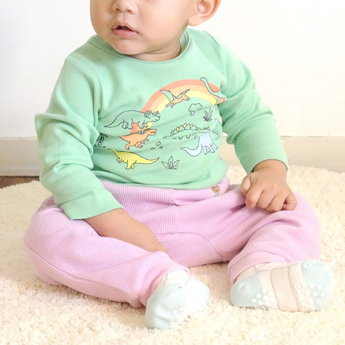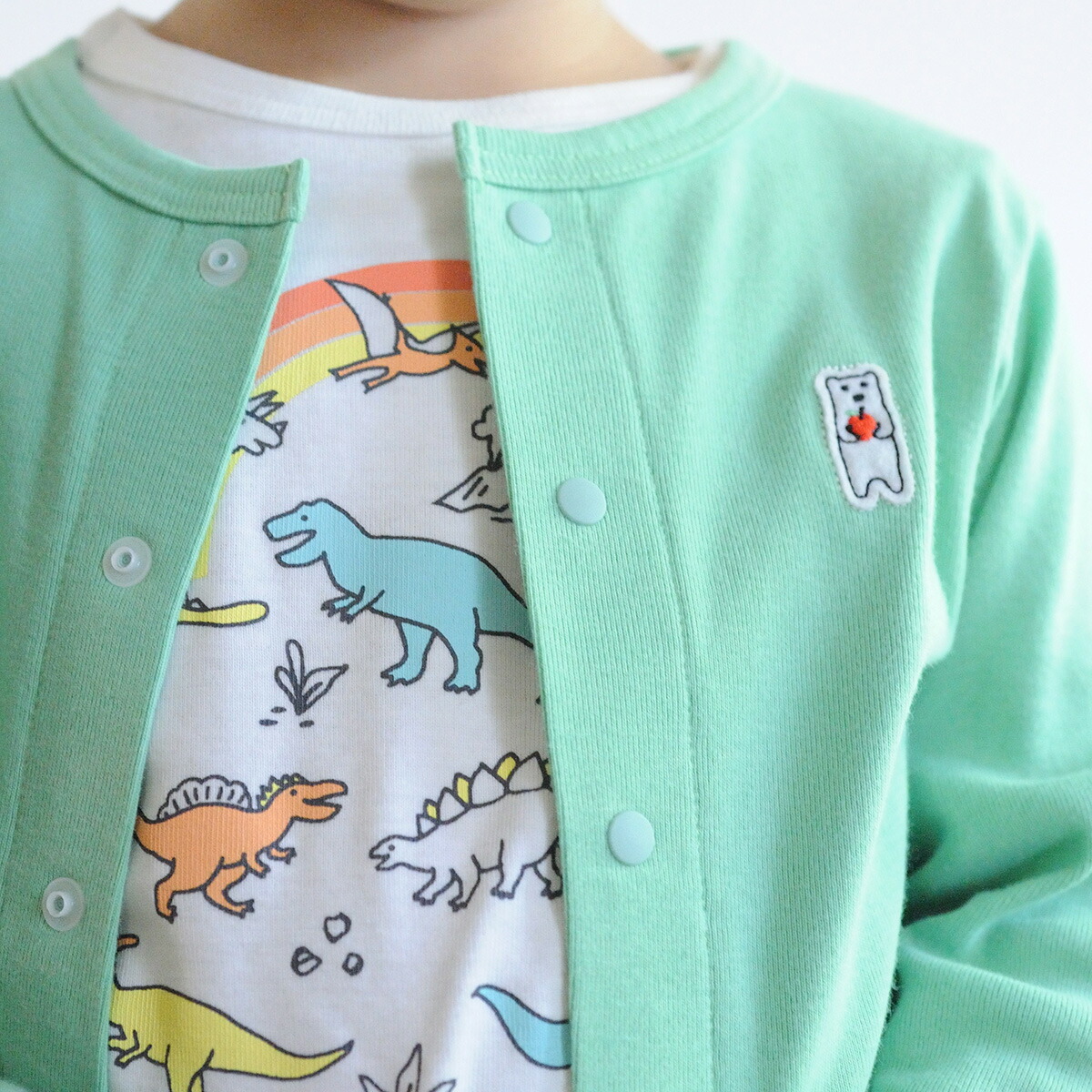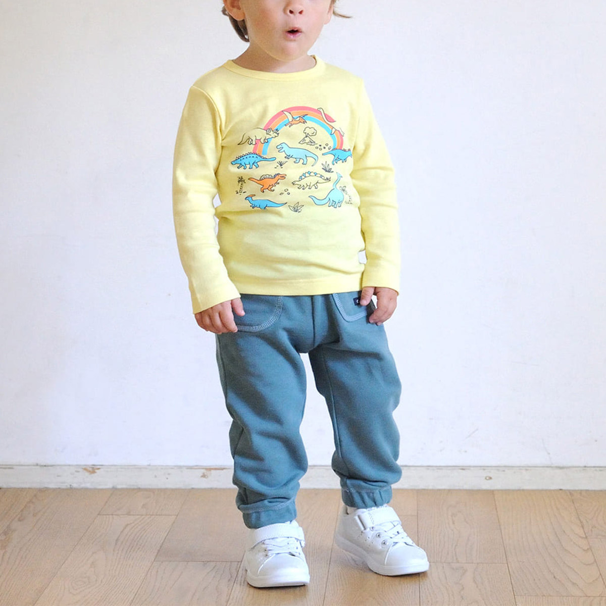 のびがよくやわらかな、綿100%フライス素材の長袖らくちんTシャツです。春を感じるオフホワイトや明るいビタミンカラーに、キッズが大好きな恐竜たちとレインボーをプリントしました。着るだけでパワーがでそうな、元気印のトップスです。肩開きなしでお着替えカンタン。