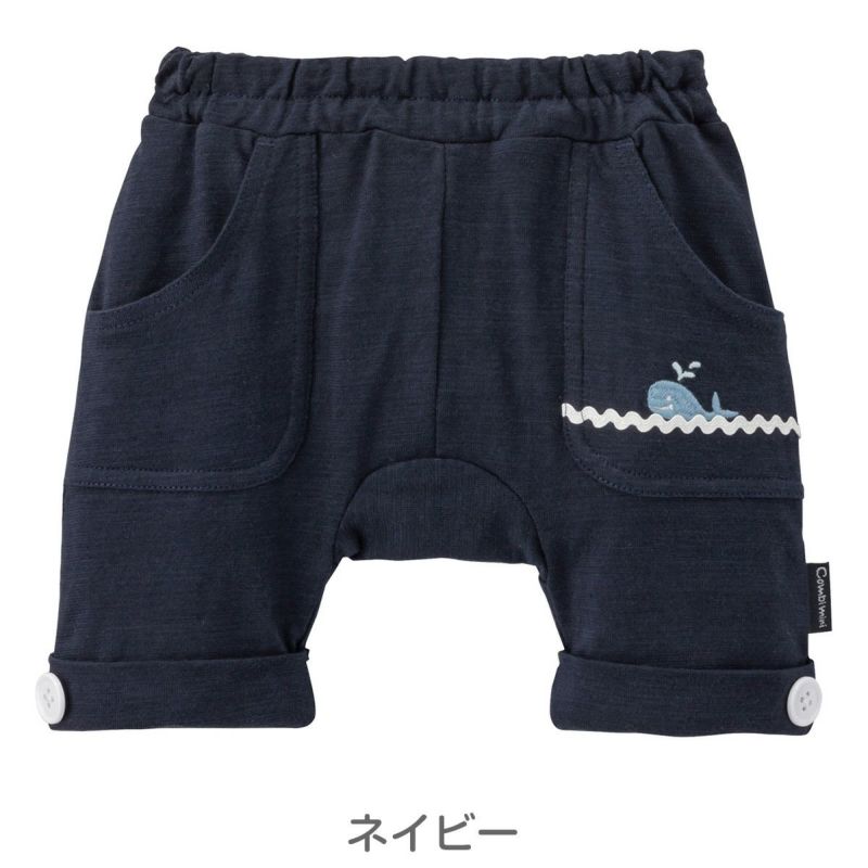 左ポケットの波を表現したテープとくじら刺しゅうがユーモラス。夏のデイリーウェアとして活躍しそうな、ショートラップパンツです。裾の白の飾りボタンで、マリンテイストをプラスしました。はっきりとした色使いも着こなしのポイントになって、元気いっぱいなキッズにぴったり。さらっと肌に心地よい薄手の綿100%スラブ天竺素材を使用しています。