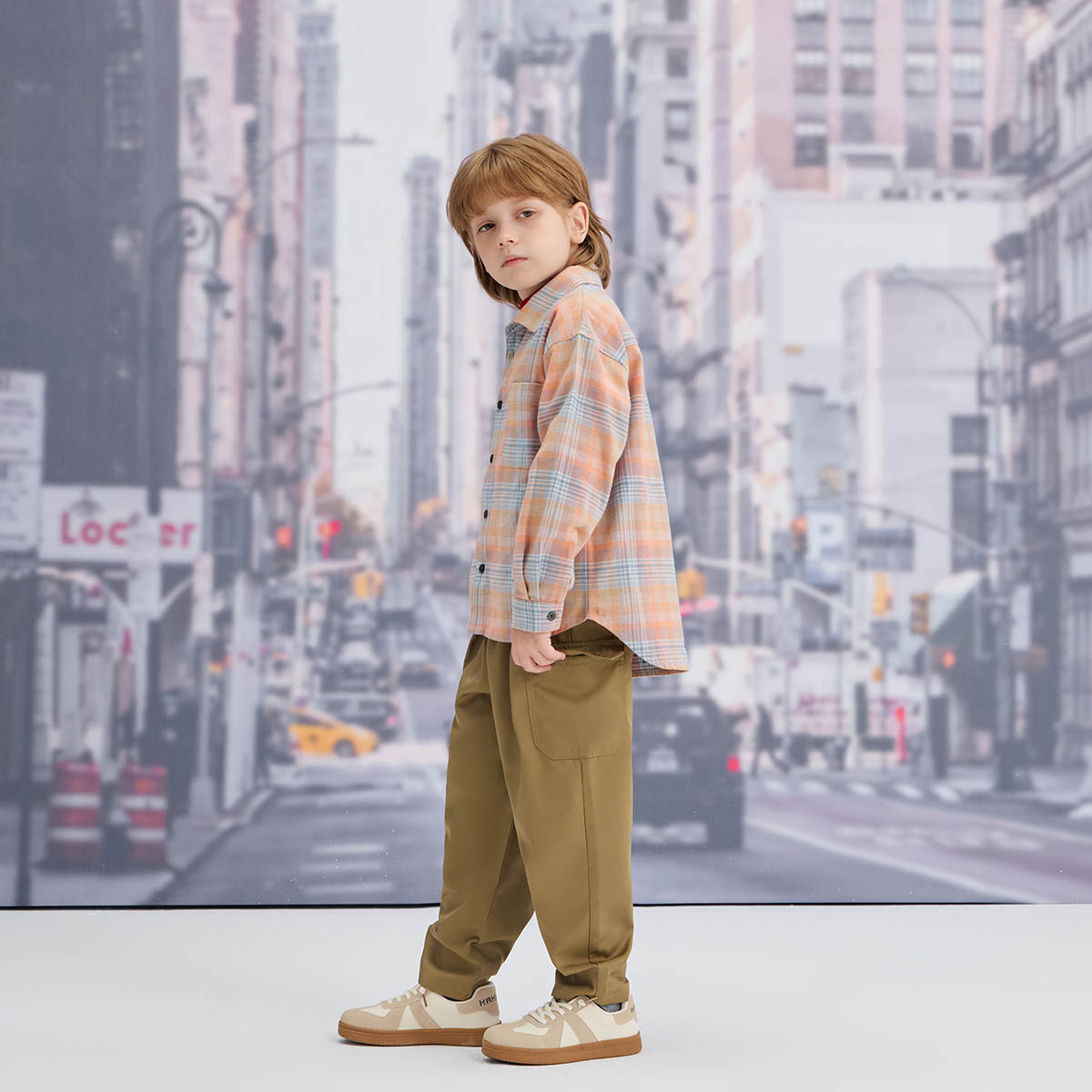 【仕様】トレンドのテーパードパンツは、前身頃にタックを取った、ゆったりシルエットで110~140サイズ展開です。