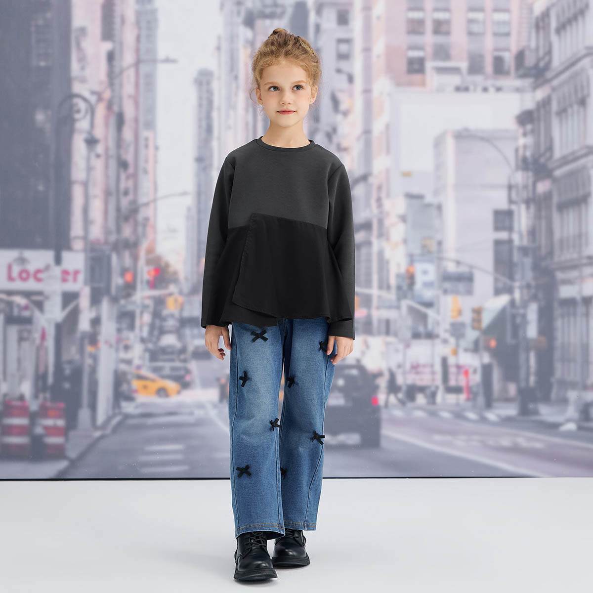 【デザイン】デイリーなスタイリングには欠かせないフルレングスのデニム調パンツ、前身頃にあしらった黒の飾りリボンがカジュアルに振れすぎないデニムスタイルを楽しめるガーリーな一枚です。