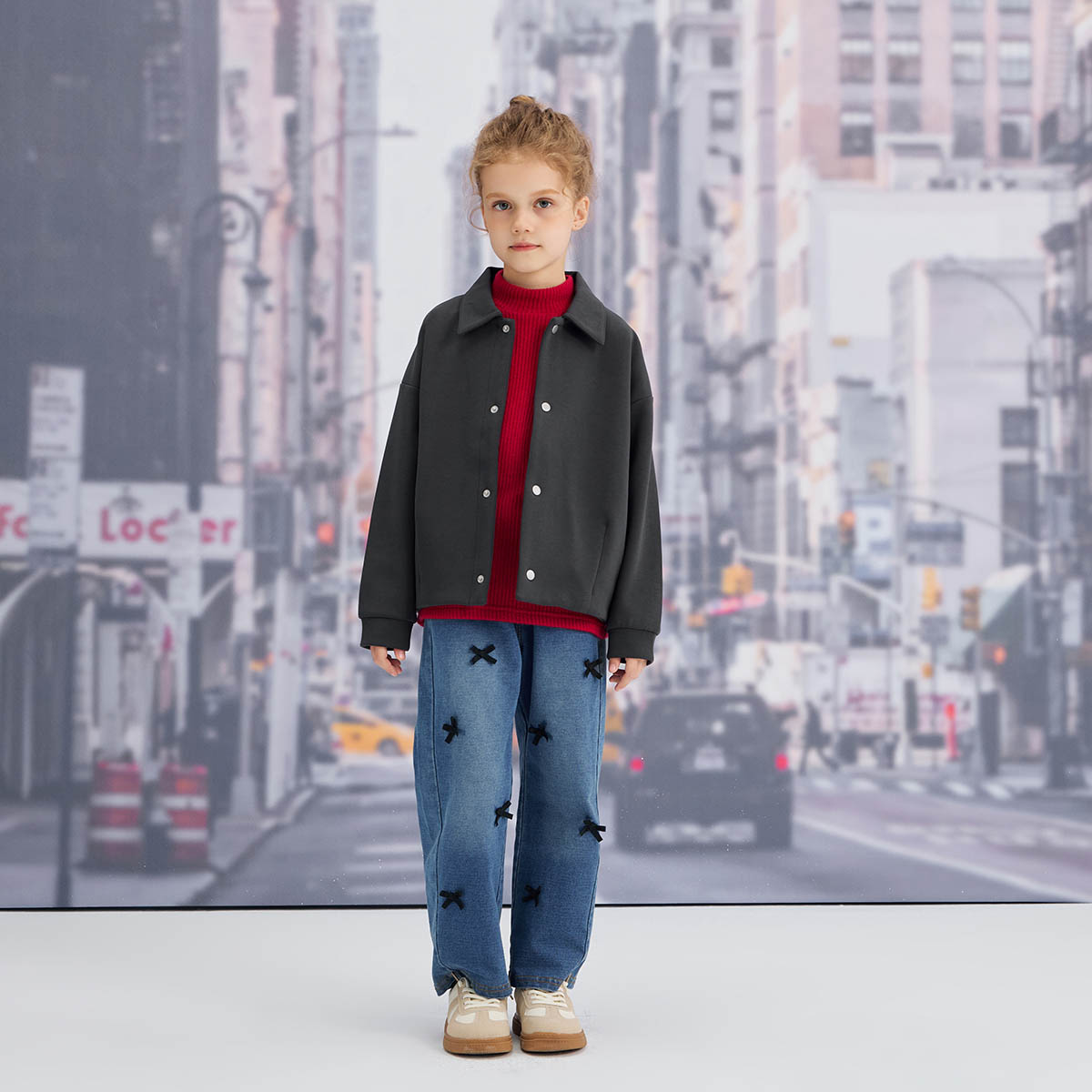 【素材】厚すぎず、伸縮性も兼ね備えた柔らかな風合いのデニムニット生地、動きやすく運動量の多い子供にも適した生地です。