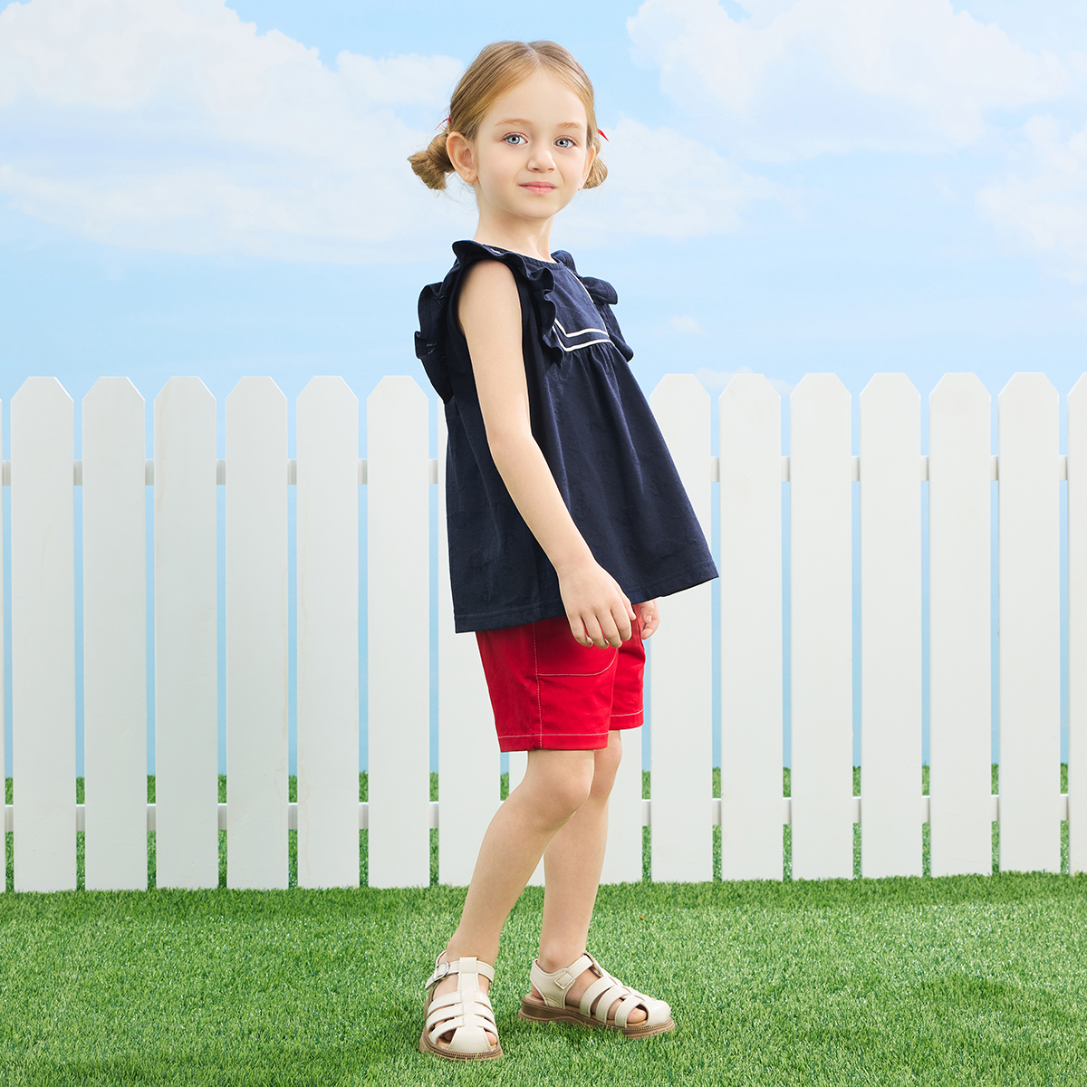 【仕様】夏らしく活動的に動くシーズンにピッタリのひざ上丈にしました。後ろポケットやサイドポケットもついていて利便性・汎用性を高めています。