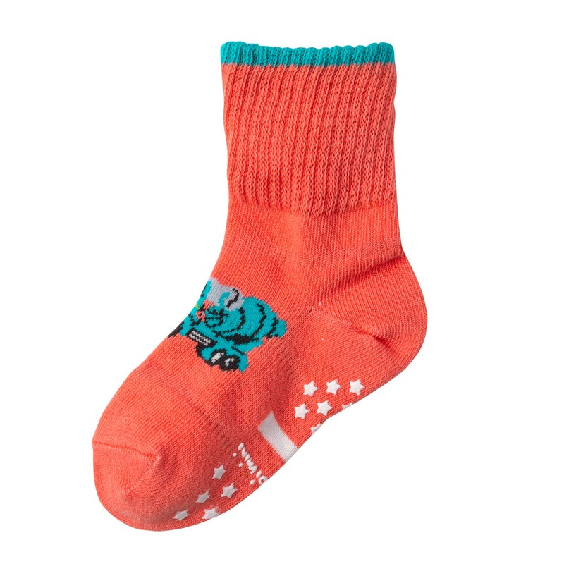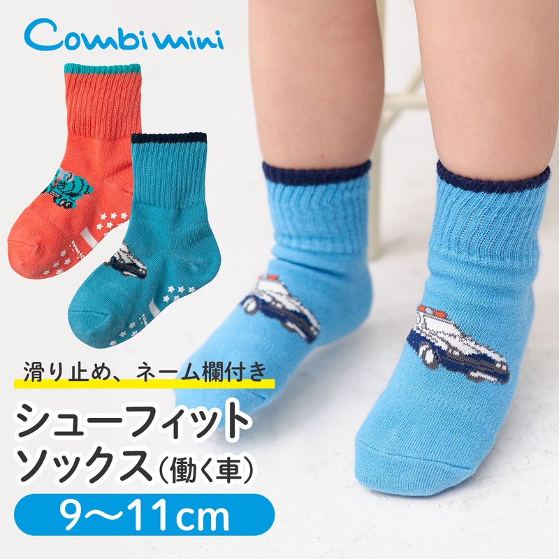 元気なキッズに人気の働く車をモチーフにしたシリーズに、ミキサー車とパトカーが登場。ズレ防止ゴムやY字ヒールなど脱げにくい工夫と、つま先&かかとの厚手仕様、やわらか幅広リブなど履き心地を考え、長く愛用できる機能が満載のシューフィットソックスです。足裏には滑り止め&ネーム欄付き。