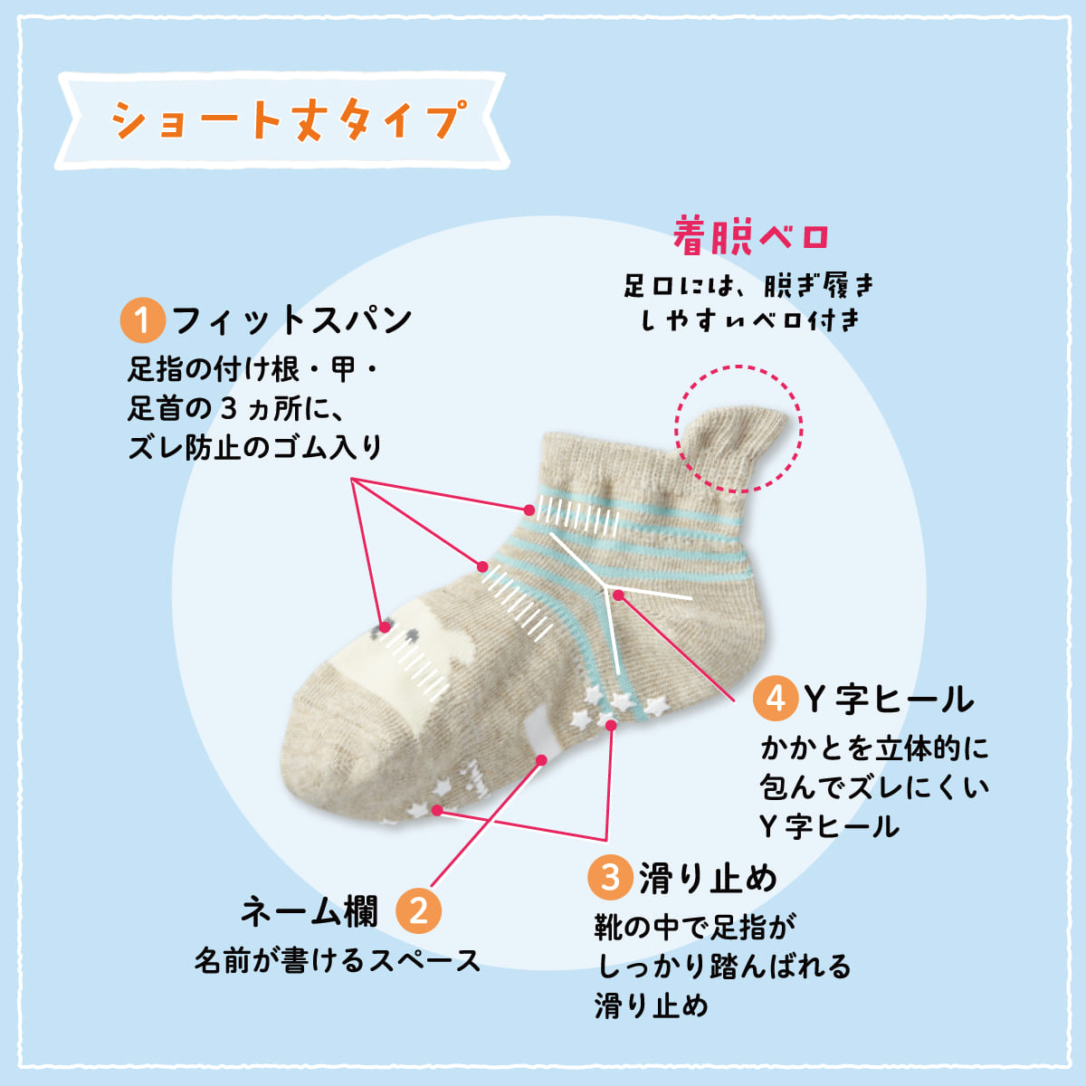 着脱に便利なベロ付きの、幾何学模様柄ショート丈ソックスです。足にしっかりフィットとして脱げにくいフィットスパン入りで、Y字ヒールと脱げにくい工夫もいっぱい。男の子にも女の子にもおすすめ。