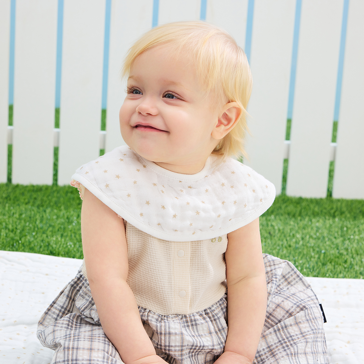 【仕様】丸い形のスタイだから、どの角度でも使いやすく、よだれや吐き戻しをしっかりキャッチしてくれます。向きを変えて使用する箇所を変えれば清潔に保てるのも特徴です。オシャレな印象のラウンド型スタイはちょっとしたお出かけにも重宝するアイテムです。