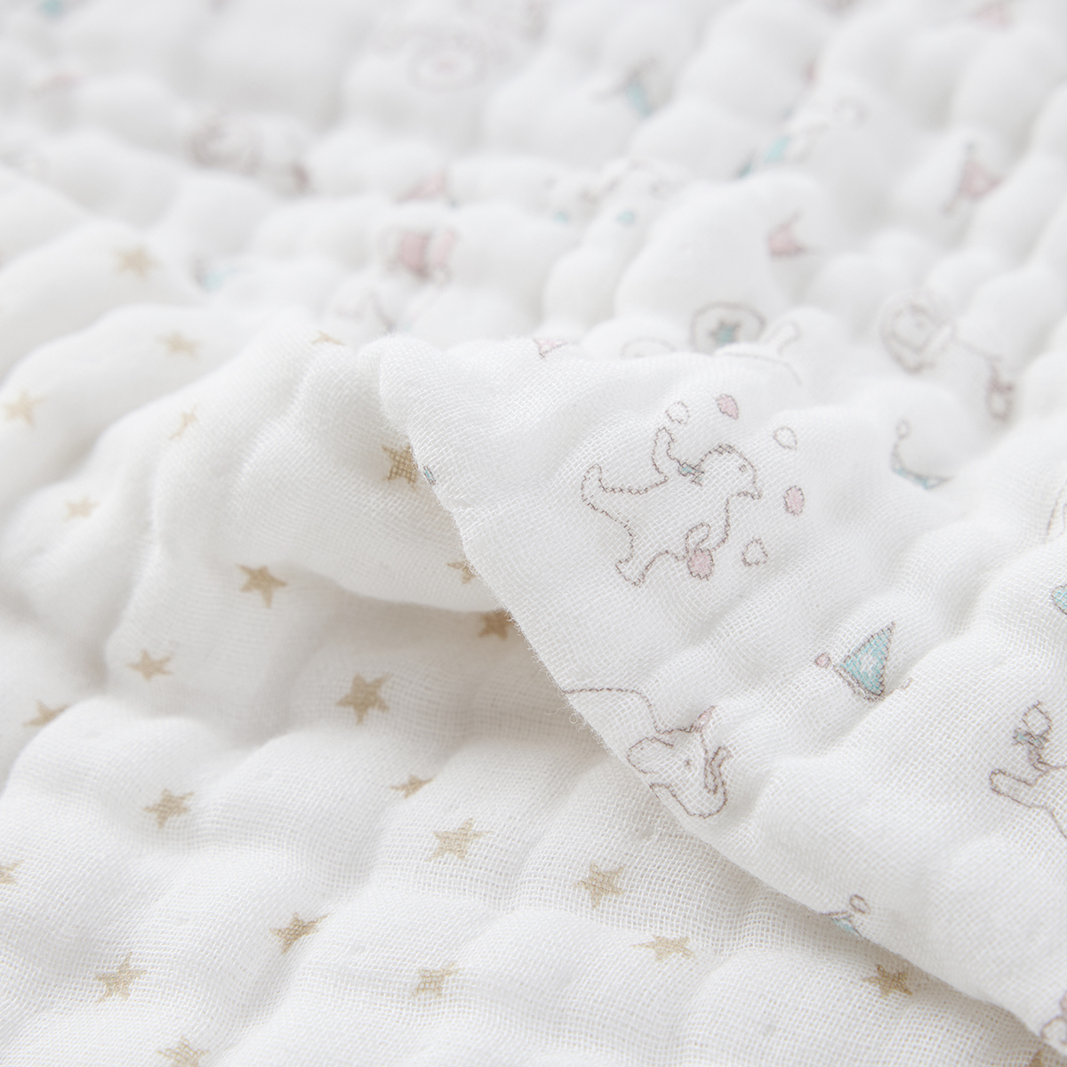 【素材】洗うほどに柔らかさが増すふんわりとした肌触りの6層連続ガーゼは、吸湿発散性に優れ、汗や水分をしっかりと吸収し湿気は外に逃がす特徴があります。6枚の生地を重ねた6層の間に空気を含むので保温性も高く軽いので、赤ちゃんにピッタリの素材です。また、速乾性も高く乾きやすいのでスタイとしても最適な素材です。