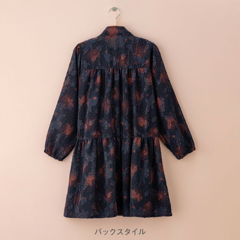 透け感のあるエレガントなレディ気分のボウタイ付きシフォンワンピース。花柄カットジャカードに小花プリントをのせた日本製生地は、熟練した技術を必要とする高級素材です。おでかけやフォーマルシーンにおすすめ。肌触りのよいソフトな綿100%のインナー付きです。