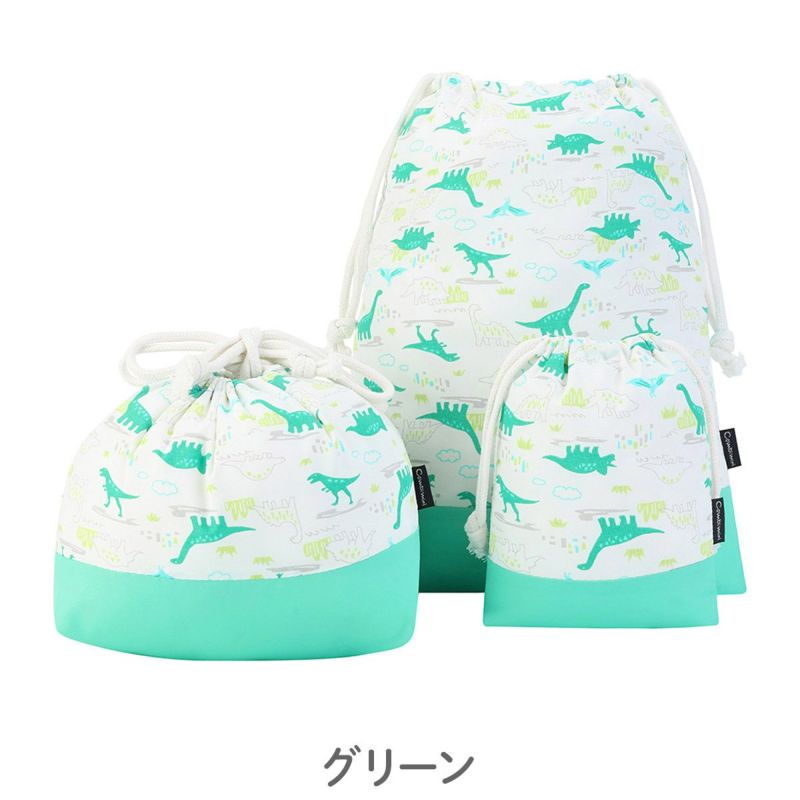 汚れがつきにくい、お食事エプロンと同じはっ水素材を使った巾着の3点セット。大サイズはお着替え用、マチ付き中サイズはお弁当、小サイズはマグや小物入れとしておすすめ。定番柄に加えてフェミニンな小花柄を新たにご用意しました。シューズバッグとお揃いも出来ます。内側に名前が書けるネームタグ付き。