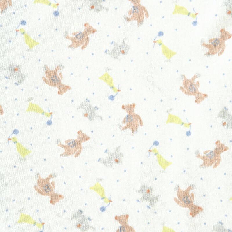 クマさん、アヒルさん、ゾウさんと愛らしい動物たちと一緒。男の子も女の子もかわいく着られるワンタッチ肌着です。( 7分袖、外縫い仕様 )