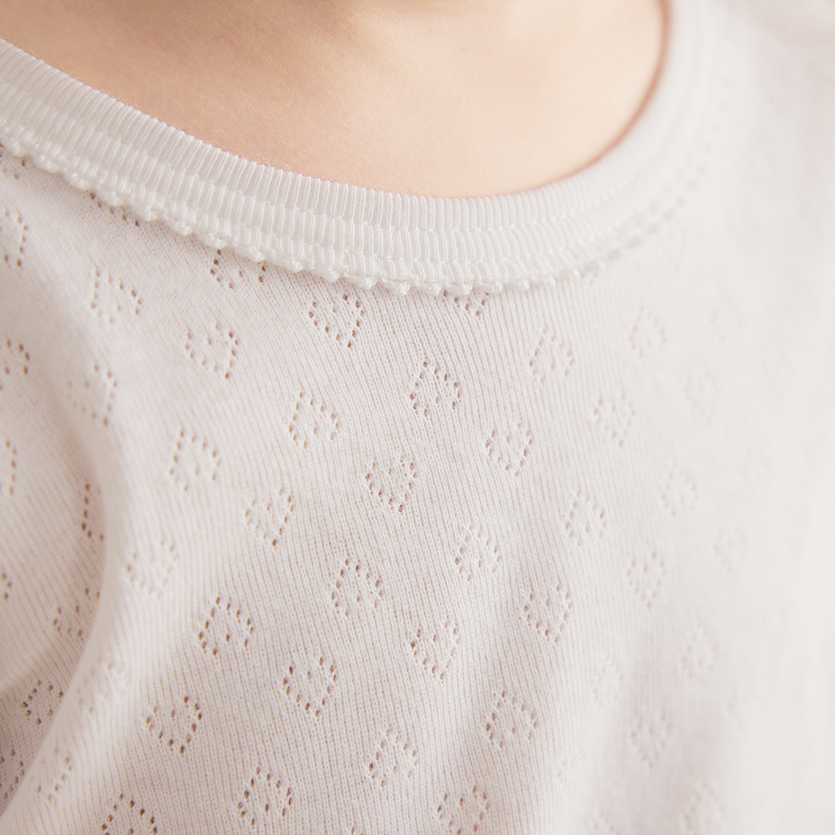 【素材】無地見えなのにハート柄が入っているアイレットフライスは、伸縮性のある肌ざわりの良い綿100%の素材です。
