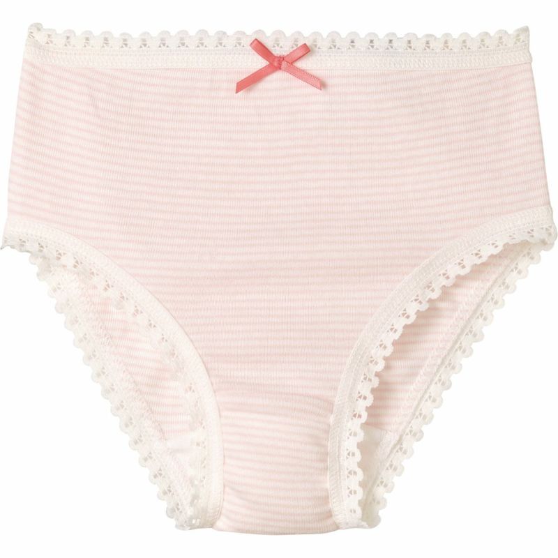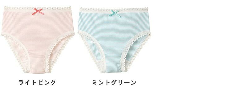 【柄】ライトピンクとミントグリーンの2色展開で、シンプルなボーダー柄に女の子らしいレースとリボンをあしらいました。