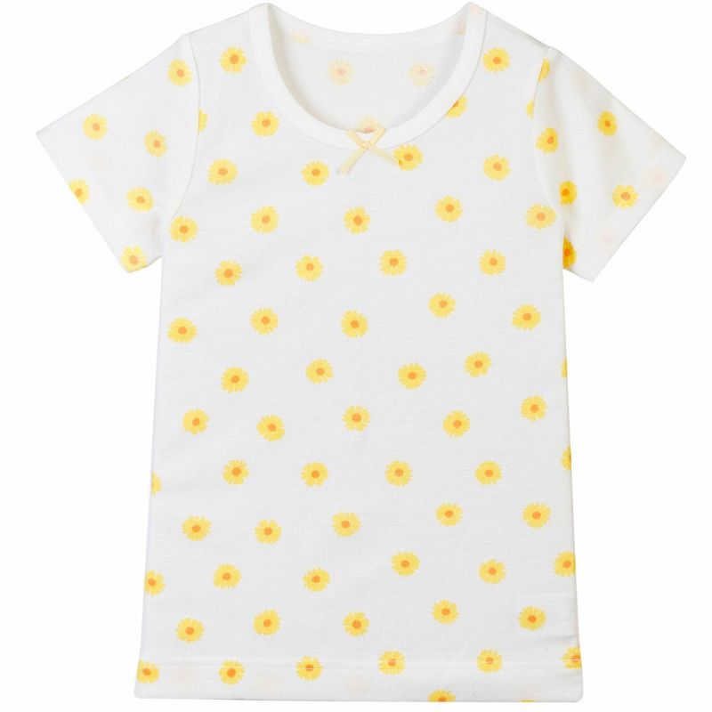 元気で可愛らしいマーガレット柄にリボンのワンポイントがキュート!お部屋着感覚で着られるTシャツタイプです。吸収速乾性に優れたフライス素材を使用しているので、汗を吸収して乾きもスピーディー。時間がたってからの汗冷えを防ぎます。春夏はもちろん、厚着でムレやすい秋冬にも使えるので、オールシーズンで活躍すること間違いなし。