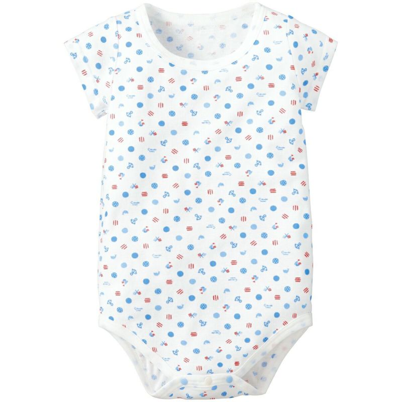 汗をかいても快適な肌ざわりを保ち、動きやすさも抜群なさらさらキープのフライス素材。はいはいボーイをさわやかな着心地で包みます。( かけ違い防止ボタン付き、70サイズは左肩開き )