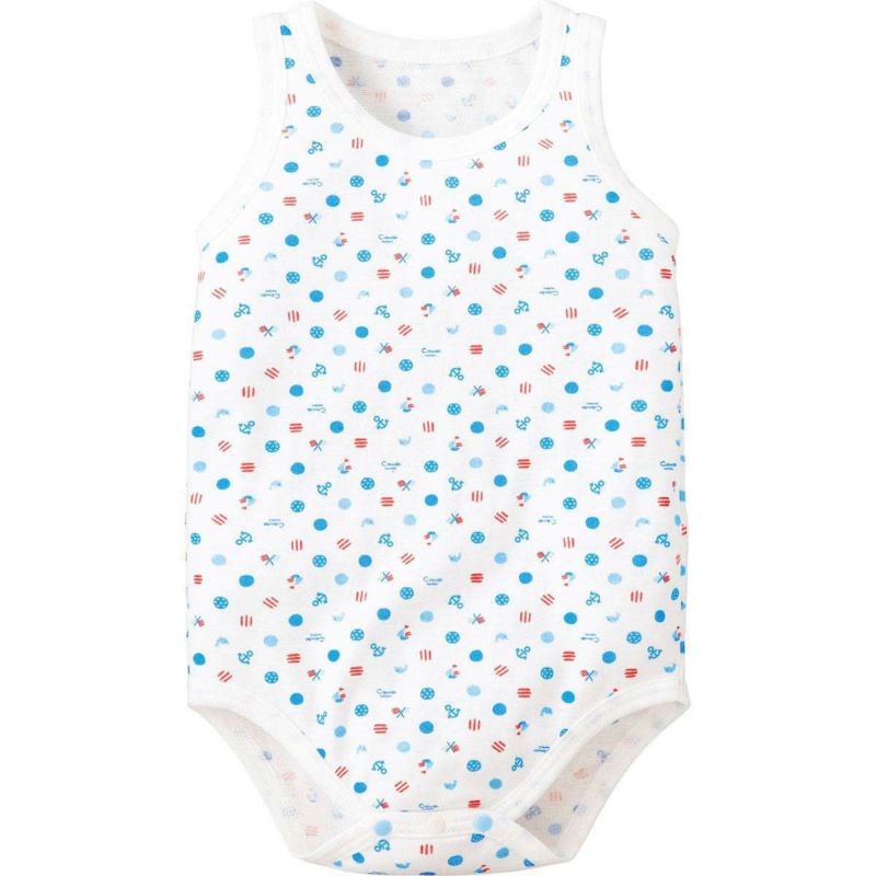 伸縮性だけでなく、吸汗性・通気性に優れ、肌ざわり快適なさらさらキープのフライス素材。マリンなプリントが男の子にぴったりです。( かけ違い防止ボタン付き )
