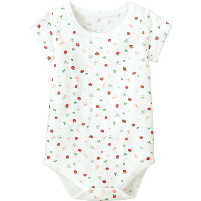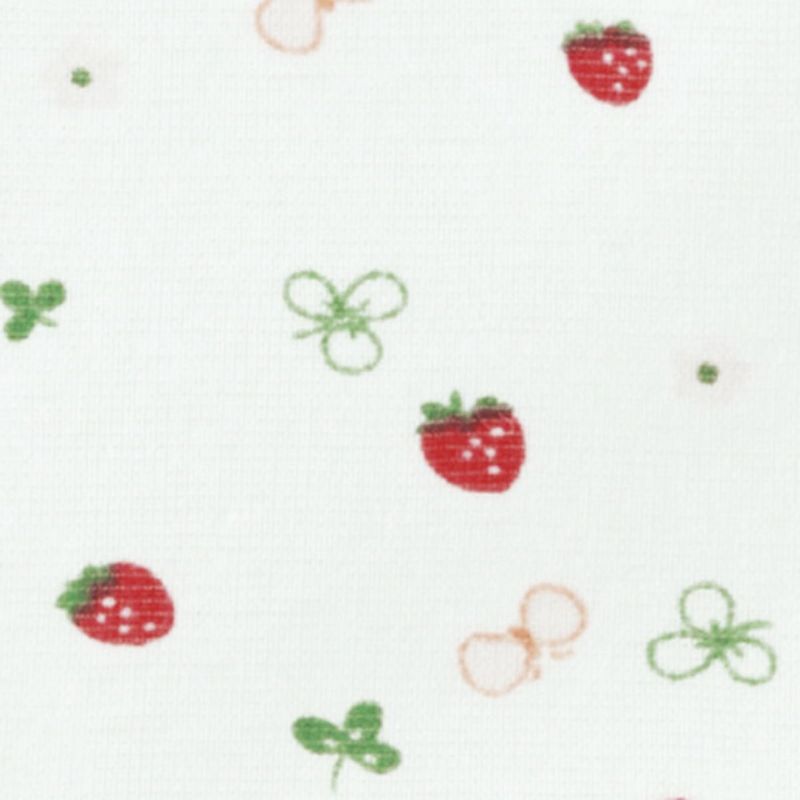 伸縮性はもちろん、通気性・吸汗性に優れたさらさらキープ素材。いちごやちょうちょなど女の子らしいモチーフをプリントしました。( かけ違い防止ボタン付き、70サイズは左肩開き )