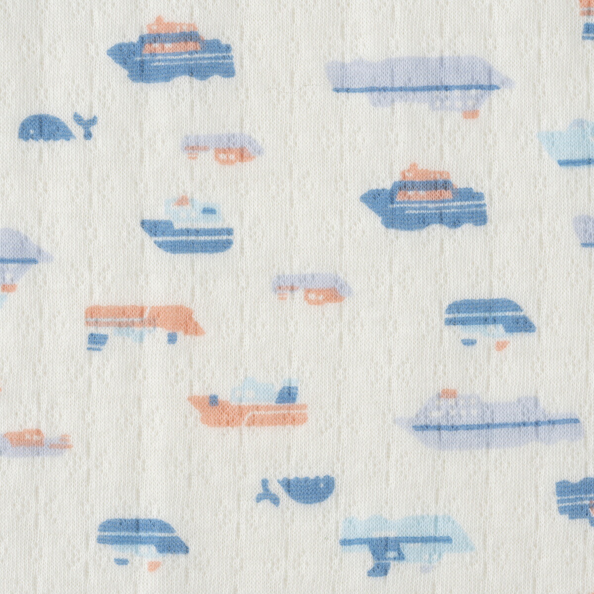 生地と生地の間に空気を含むので、ふんわりやわらかく、ほどよい温もりが心地いい綿100%エアーニット素材の半袖ボディTシャツ。やさしい色合いの船とくじらの柄が可愛らしい。股下ボタンは真ん中だけ色を変えて、かけ間違え防止仕様にしています。