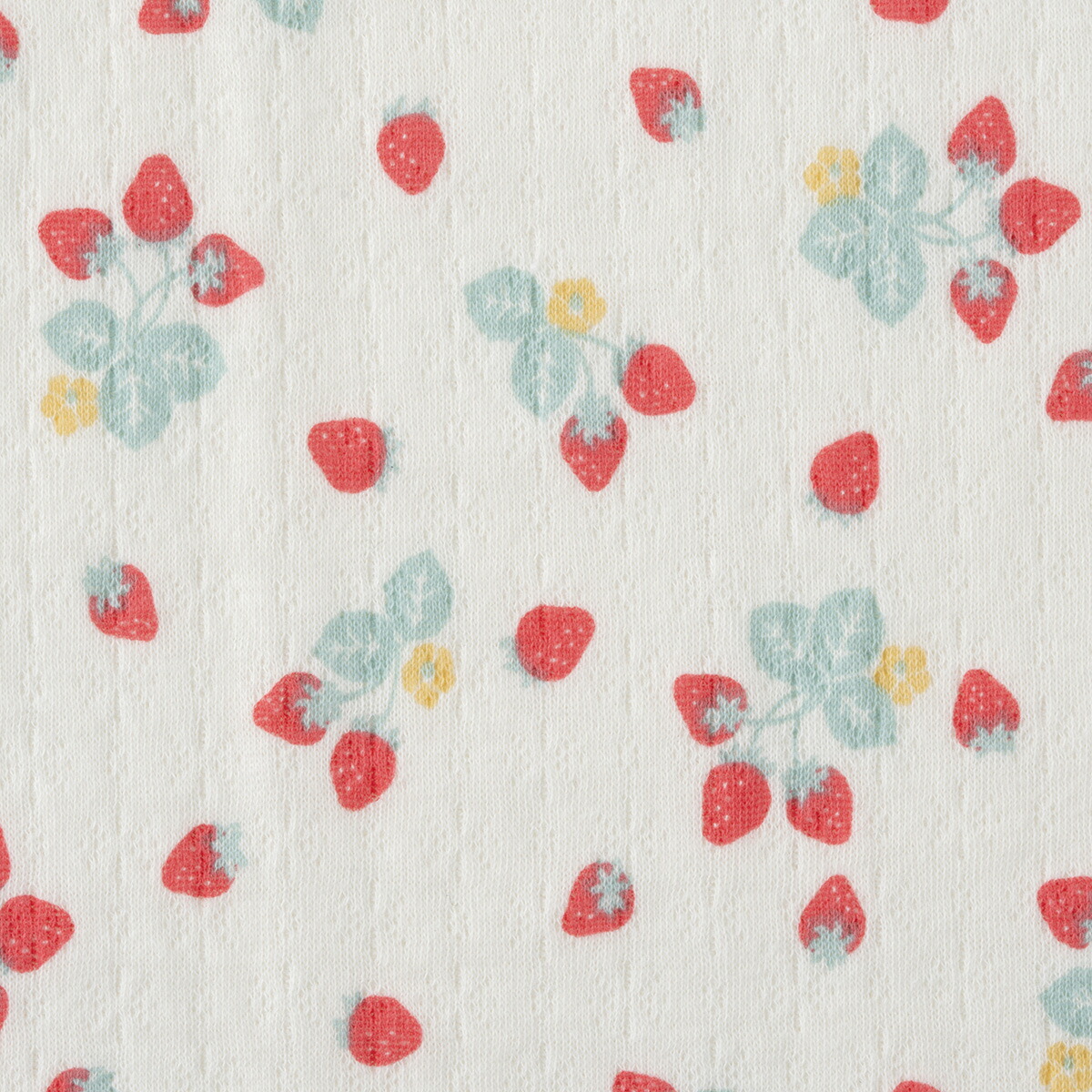 鮮やかないちご柄がとってもキュート!生地と生地の間に空気を含むので、ふんわりやわらかく、ほどよい温もりが心地いい綿100%エアーニット素材の半袖ボディTシャツです。股下ボタンは真ん中だけ色を変えて、かけ間違え防止仕様にしています。