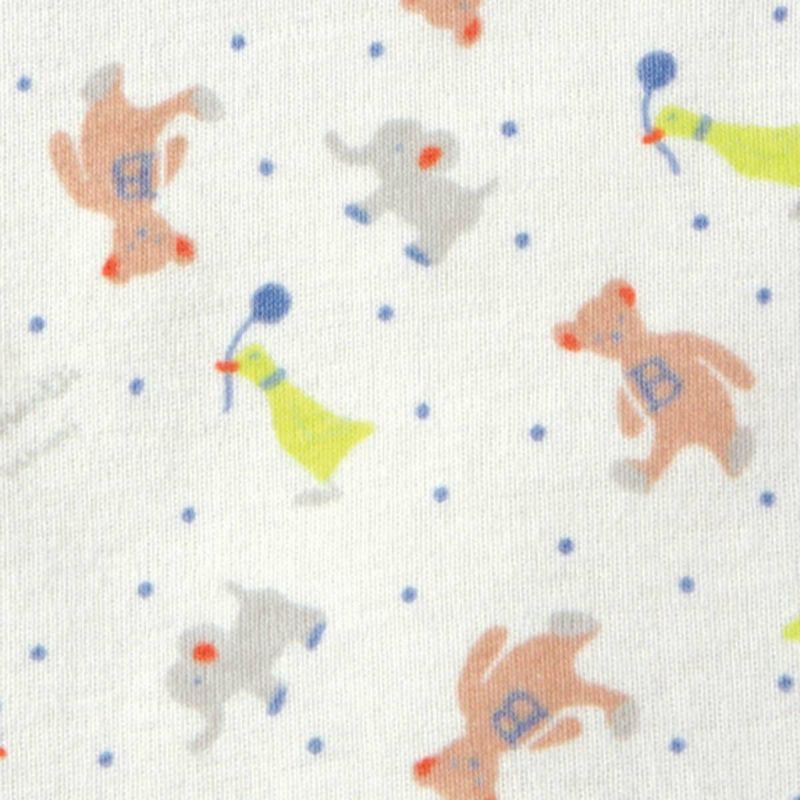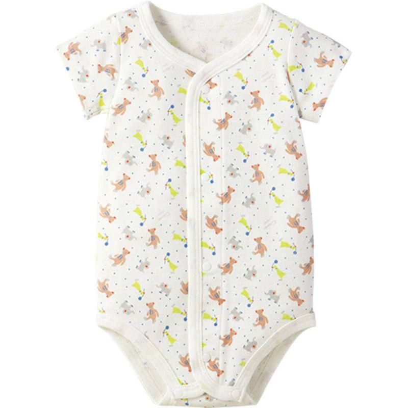 お着替えさせやすい前開きのボディT。型くずれしにくいフライス素材を使用しました。カラフルなクマちゃん柄がキュートです。( かけ違い防止ボタン付き )