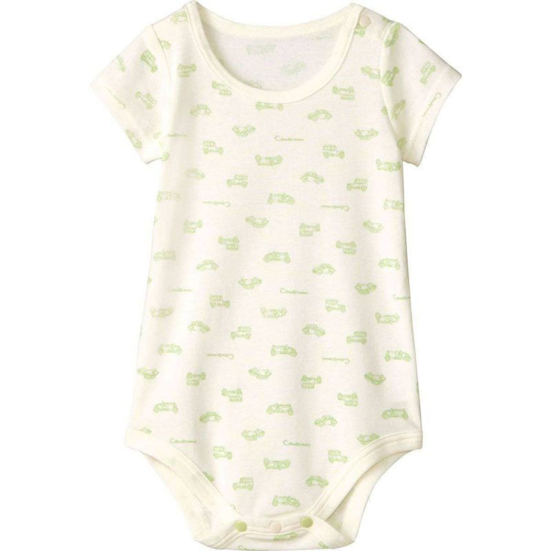 クラシックカーのプリントが男の子らしい半袖ボディTシャツ。汗をかいてもすばやく乾くさらさらキープ素材。股下にはかけ違い防止ボタンも付いています。(ベビーからキッズまで着られます)