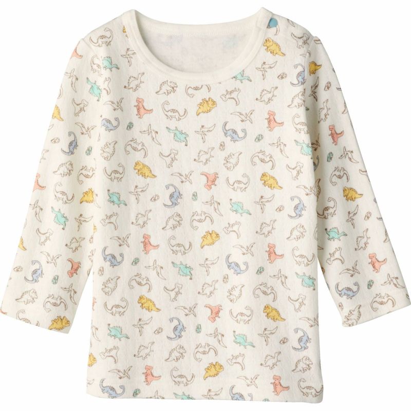 秋冬の寒さからキッズを守る長袖インナー。男の子が大好きな恐竜たちのプリント柄です。素材は肌ざわりがよく心地よいぬくもりのエアーニット。あたたかくなりすぎないので元気な男の子に最適な素材です。