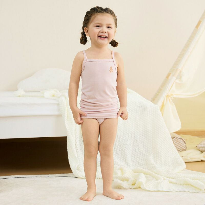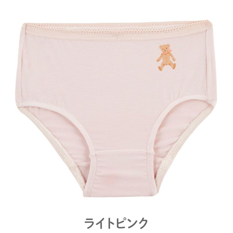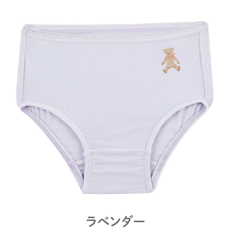 【仕様】女児に人気のあるライトピンクとラベンダーの2色をご用意しました。ウェストにレースをあしらい、定番テディベアのワンポイントプリントが施されています。 【サイズ展開】新素材モダールショーツにも140cmをご用意いたしました、ぜひお試しくださいませ。