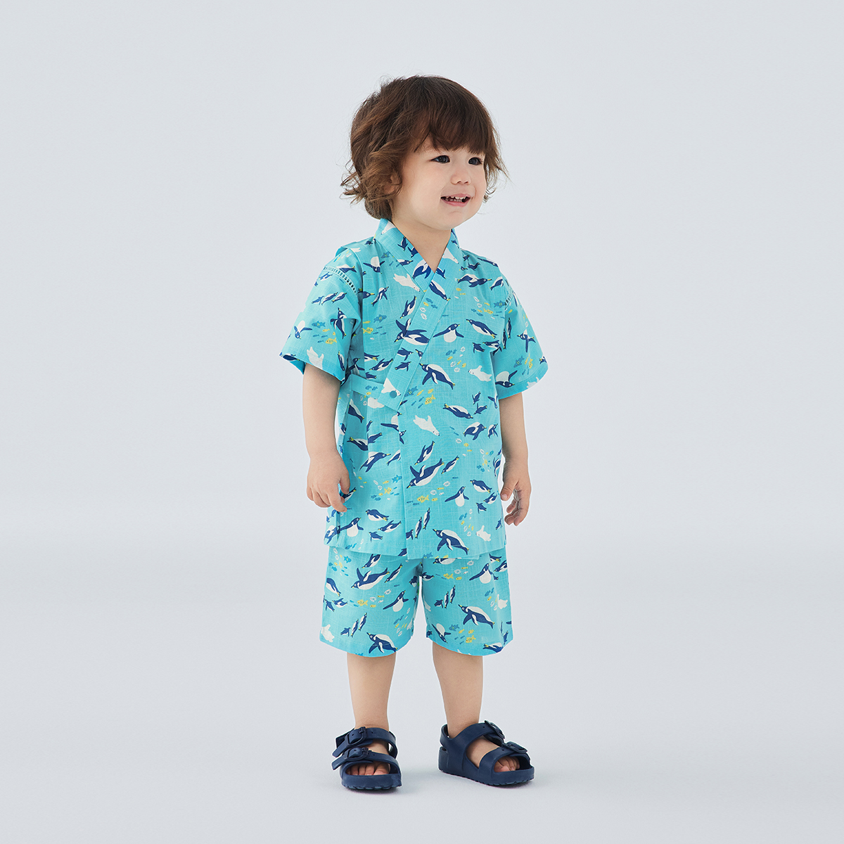 ペンギンやシロクマ、魚たちが水中をスイスイと気持ちよく泳いでいる柄の甚平は、北極の海をイメージしたキレイなエメラルドグリーンで、清涼感を感じさせる一品です。生地は通気性がよく、さらっとした肌ざわりと表情のあるスラブシーチングを使用。袖部分にはハシゴレースを取り入れて、暑い日でも熱がこもらないように仕上げました。