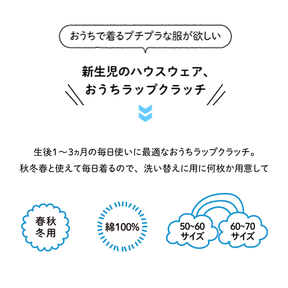 【仕様】着くずれしにくいパンツ型ウェアはチャイルドシートなどのベルトもスッキリ留めやすい!ワンタッチテープの仕様でサッとお着替え出来るので、おむつ替えがカンタン。ワンタッチ短肌着を入れて重ねてお着替えすれば、さらにカンタン!忙しい毎日でも赤ちゃんとの時間が長く取れるようにおむつ替えが時間短縮で赤ちゃんもママも笑顔に。