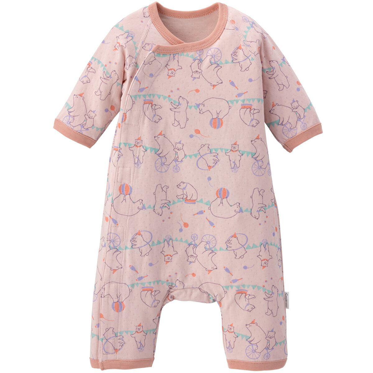 やわらかで、しっかりとした綿100%接結天竺を使ったラップクラッチです。サーカスでいろいろな芸を披露するしろくまモチーフの総プリントがにぎやか。ワンタッチテープでサッとお着替え出来るので、おむつ替えもラクチン。同柄のキッズパジャマとおそろいも楽しめます。