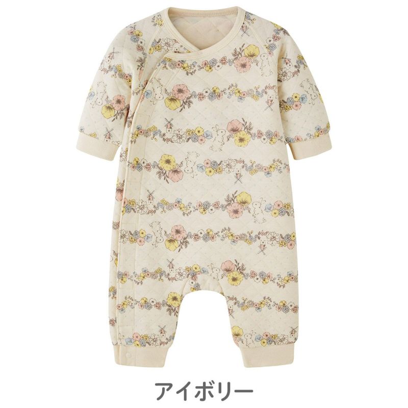 【柄】カラーOW:くまさんの洗濯総柄は、さまざまな洗濯物と、くまさんが一緒に吊干しされていて、愛くるしく楽しい仕上がりに。カラーMG:モノトーンベースのぞう総柄は王冠やカラフルな帽子をかぶったゾウたちが散りばめられている総柄で男女ともにおすすめです。カラーIV:うさぎとイエロー・ピンク・ライトブルーのパステル調でカラフルなお花をボーダー柄に見立てて配置しました。3色ともに同柄であったかニットキルトパジャマもあるのでベビー&キッズのおそろいで楽しめます。(品番648250/648255)