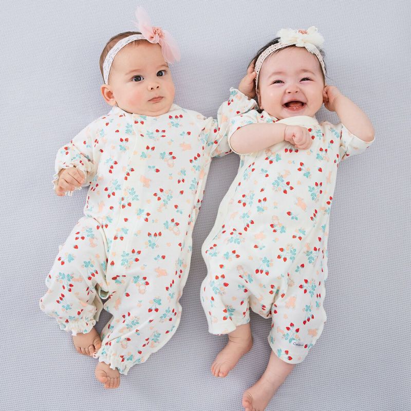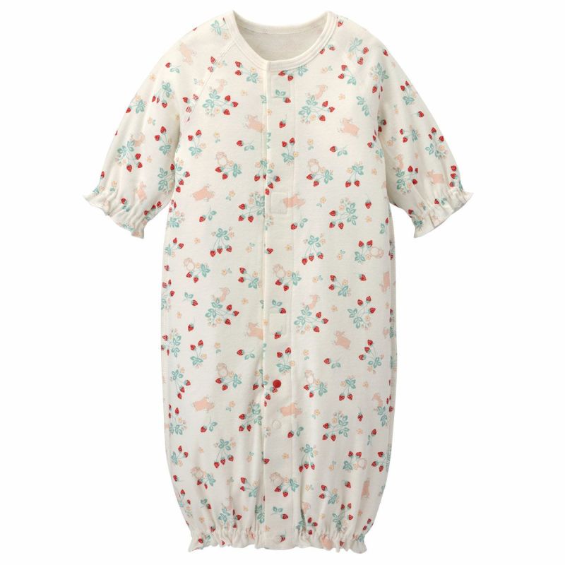 【柄】可愛らしさ全開のツーウェイオールはキュートないちご&うさぎの総柄で女の子にピッタリ。ベビーギフトにもおすすめです。