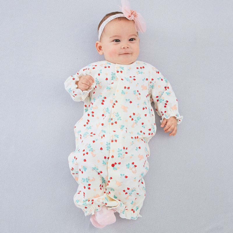 【仕様】袖口と裾をフリル仕様にしたガーリーなツーウェイオールは、新生児期はオムツ替えしやすいドレスとして、足をバタバタさせるようになったらカバーオールとして使えるので長く愛用できます。上部はワンタッチテープ仕様でサッとお着替え出来るので、おむつ替えがカンタン。忙しい毎日でも赤ちゃんとの時間が長く取れるようにおむつ替えが時間短縮で赤ちゃんもママも笑顔に。