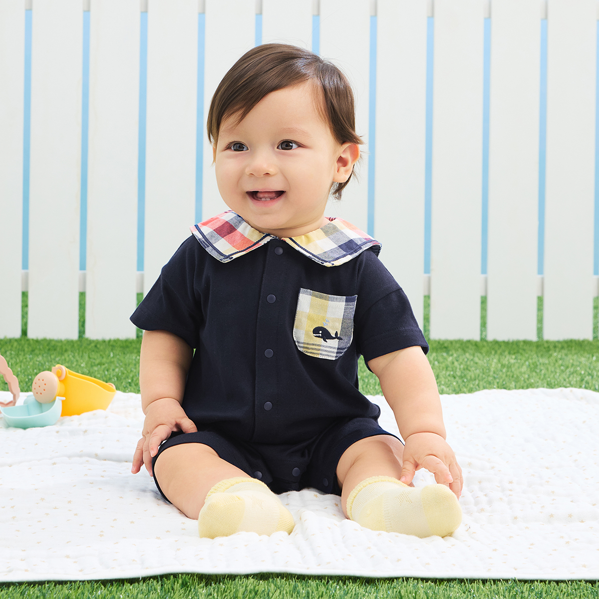 【カラー】キレイ目で落ち着いた色合いのネイビーをベースにし、トラッドテイストのオリジナルチェックをセーラー襟と胸ポケットに使用した上品な印象のカバーオール。ポケットにはクジラの刺しゅうを施しマリンテイストに仕上げました。