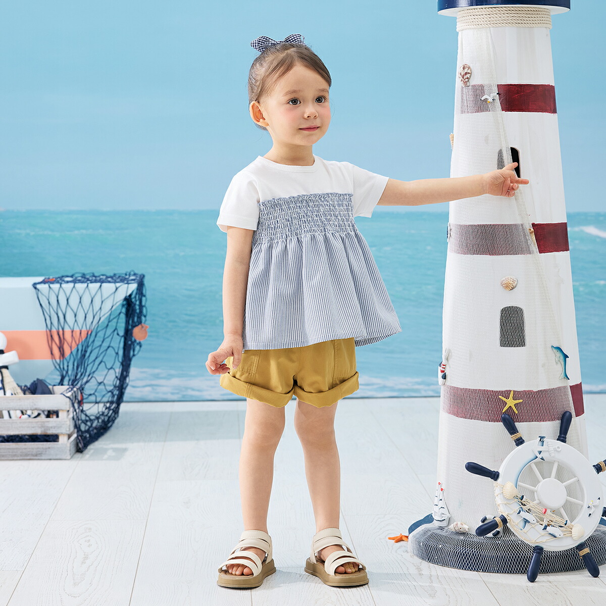 【素材】下身頃は薄手で柔らかいコードレーン生地を採用。生地感やマリンカラーの色合いが夏におススメです。上身頃無地部分は、夏らしい通気性の良い薄手のストレッチカノコ素材を使用しました。