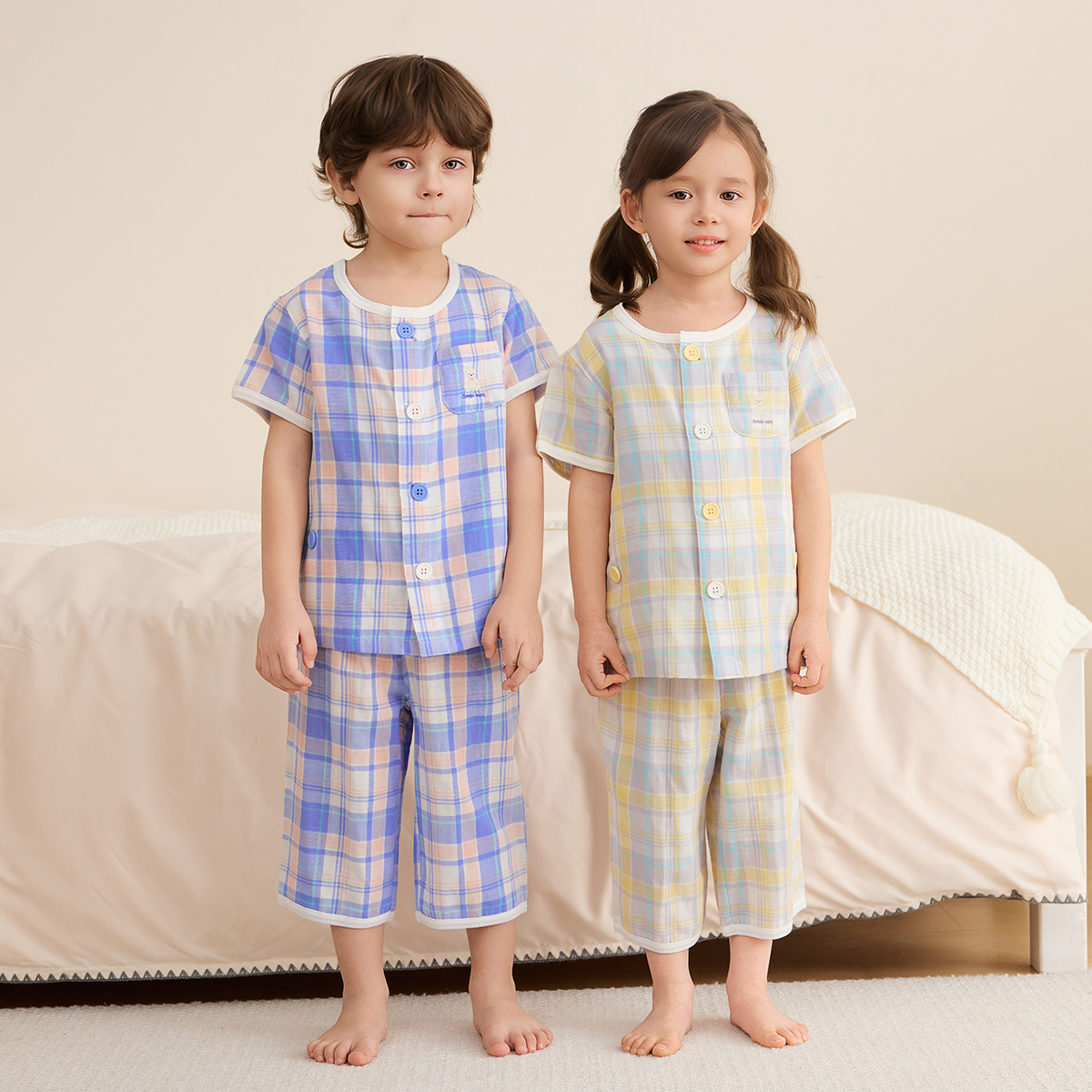 おなか安心ボタン付き半袖前開きガーゼパジャマ(先染めチェック)