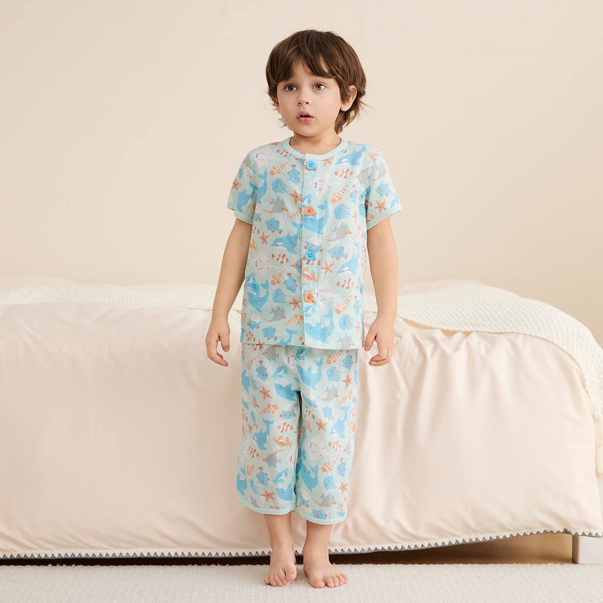 【30%OFF★期間限定★特別価格5/7(木)まで】おなか安心ボタン付き半袖前開きガーゼパジャマ(海のなかま・汽車・恐竜)