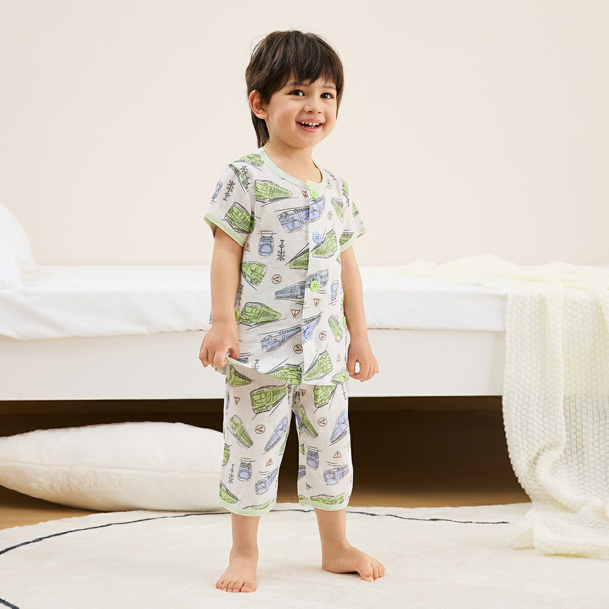 【柄】ライトピンク、ライトブルーはコンビミニ定番テディベア柄。2色展開でマリン風のフレンチスタイルをイメージした、さわやかなカラーが特徴です。ライトグリーンは、キッズに人気の電車が颯爽と走る姿をさわやかに表現し、シャチ柄は、家族で自由に海を泳ぐ姿を清涼感あふれるブルーで表現しました。オフホワイトは、物語に出てきそうな森の小動物や家を、涼しげなカラーのリースに合わせ、メルヘンチックな世界観をイメージした柄に仕上げました。