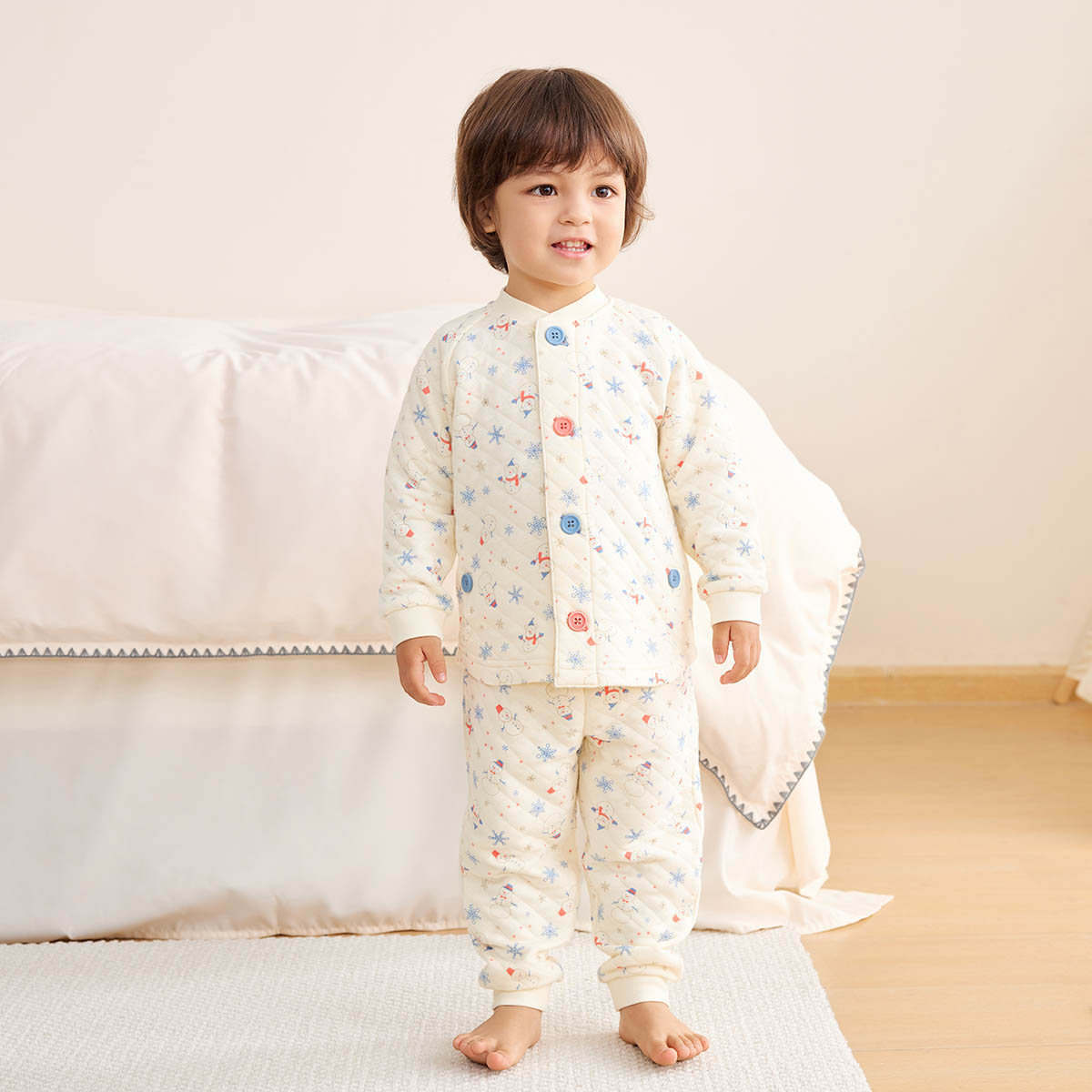 おなか安心ボタン付きあったかキルト長袖前開きパジャマ(雪だるま)