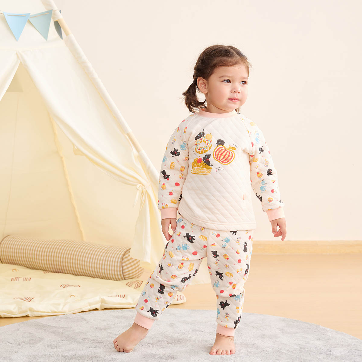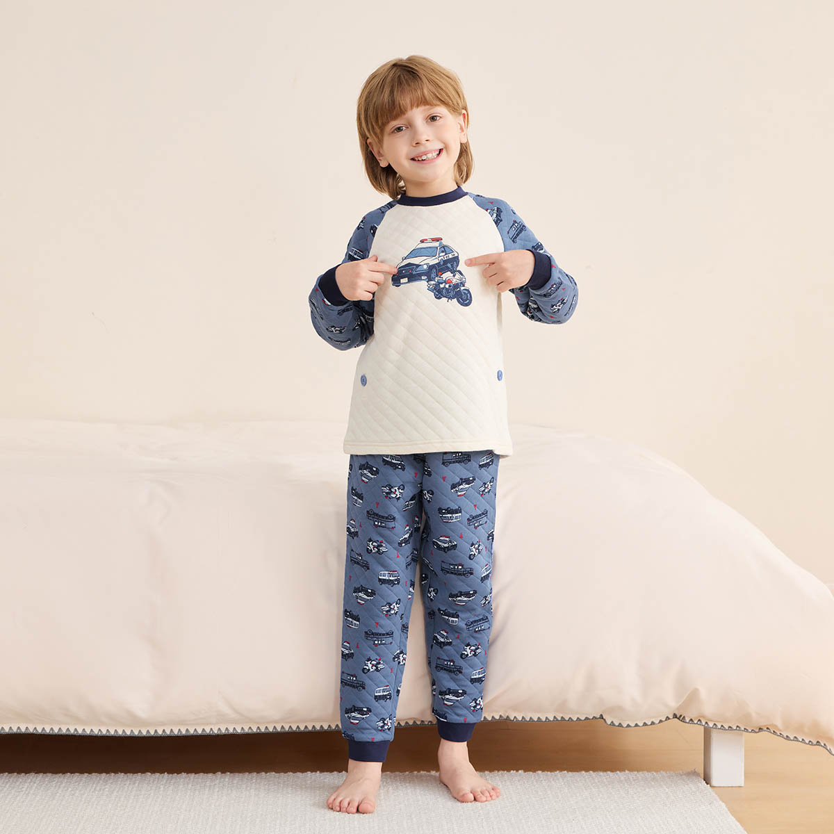おなか安心ボタン付きあったかキルト長袖パジャマ(パトカー・りんご)