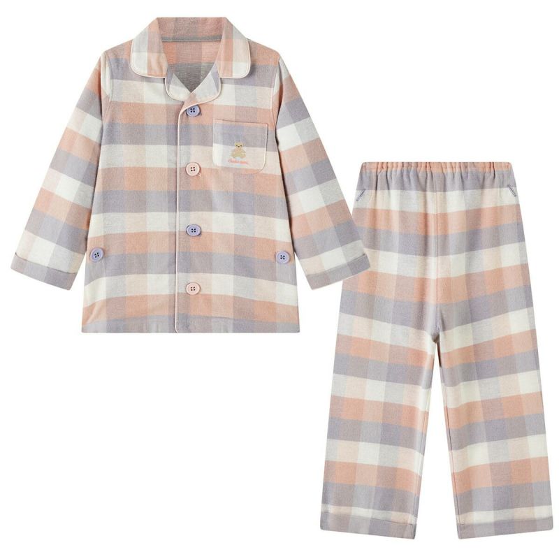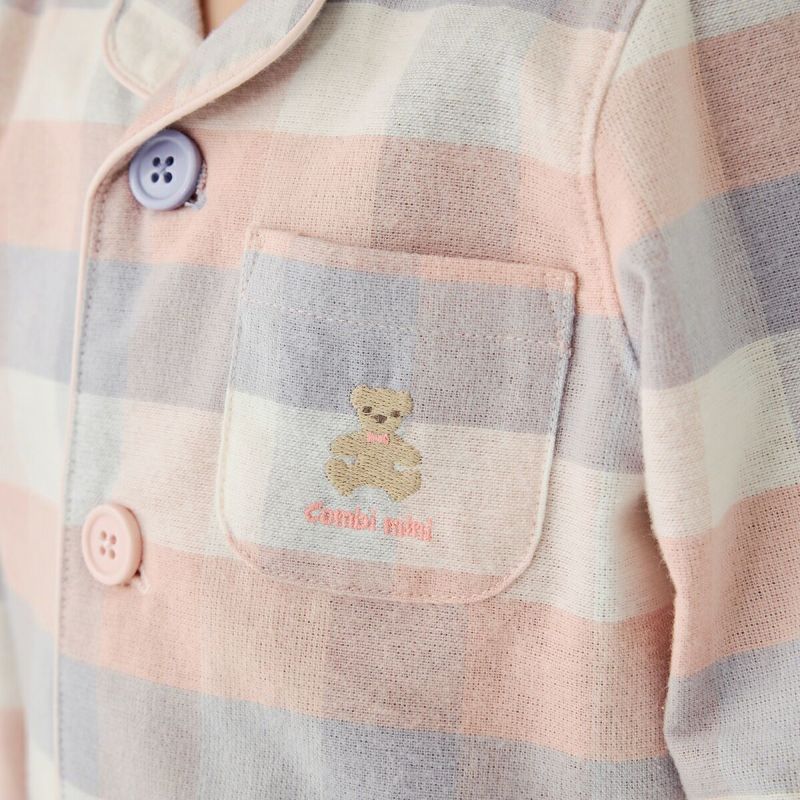 【柄】やさしい色合いのピンクと濃色で目を引くブルーの先染めオリジナルチェックに、上質感のあるコードパイピング&くま刺しゅうをアクセントに。男女ともに2カラーともおすすめです。