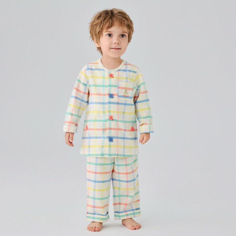 【仕様】首回りをすっきりさせたクルーネックタイプ。かけ違いを防ぐ配色ボタン&ホール仕様に加え、ボタンホールを斜めにしてボタンをとめやすくしたので、お着替えレッスンにもおすすめです。トップスがめくれておなかが冷えることを防ぐおなか安心ボタン付き。( ウエストゴム替え口付き )袖口と足口部分はステッチを外して着丈を伸ばせるアジャスト仕様。成長に合わせて長く愛用できます。